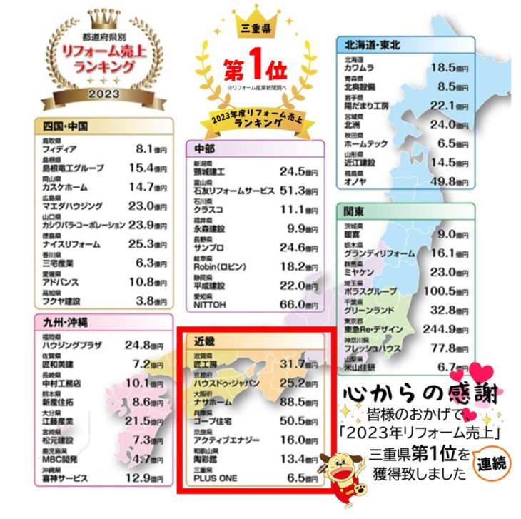 ぷらす1リフォームは、2023年も三重県の「リフォーム売上ランキングで1位」に選ばれました🎉