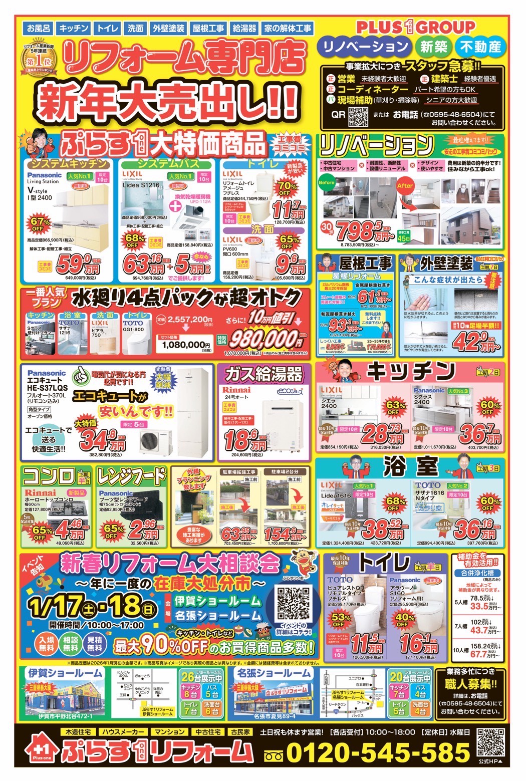 HOMEイベント・チラシ情報チラシ情報リフォームチラシ情報 リフォームチラシ情報 地域No.1のリフォーム会社の商品が今なら最大70%OFF! システムキッチンやシステムバスなどの大きなリフォームから トイレ、洗面などの小さなリフォームまでお任せください! 私たちが真心をもって対応致します! また、リフォーム以外にも外壁塗装や増築の方も承っておりますので、ご気軽にご相談ください。 ※商品価格高騰の為、表示金額と異なる場合がございます。 チラシ情報一覧 イベント・チラシ情報一覧はこちら ぷらす1リフォームについて 会社案内代表挨拶会社概要企業理念アクセスマップスタッフ紹介採用情報 コンセプト 県下最大級ショールーム スタッフブログ スタッフブログ一覧 施工事例 施工事例一覧 給湯器 キッチン 浴室 トイレ 洗面化粧台 内装 外壁・屋根 外構 小工事 増築 お客様の声 お客様の声一覧 リフォームメニュー お得なパッケージ 外装まるごとパック【限定10パック】 ¥998,000 お買い得度No.1商品 LIXIL Lidea【限定10台】 ¥309,760 台数限定の商品 LIXIL Lidea【限定10台】 ¥309,760 キッチン LIXIL シエラ【限定10台】 ¥306,267 浴室 LIXIL Lidea【限定10台】 ¥309,760 トイレ Panasonic アラウーノS160 ¥177,100 洗面化粧台 LIXIL PV600 ¥36,300 リノベーション リノベーション ¥8,783,500~ 外装 屋根リフォーム 和瓦屋根葺き替え ¥1,024,000~ 外構 YKK-ap ソラリア【限定5台】 ¥247,000 増築 6帖こども部屋増築 ¥2,780,000 小工事 Rinnai 給湯専用 RUX-K165W(A) ¥47,300 リフォームメニュー一覧 お得なパッケージ お買い得度No.1商品 台数限定の商品 キッチン 浴室 トイレ 洗面化粧台 リノベーション 外装 外構 増築 小工事 イベント・チラシ情報 イベント情報一覧 チラシ情報一覧ぷらす1の取り組み 中古リノベをご検討中の方へ お役立ち情報 ぷらす1リフォームのあったか快適リフォームSALE! 水まわり4点パック 外壁塗装最安値キャンペーン 住宅省エネ2026キャンペーン 先進的窓リノベ2026事業 みらいエコ住宅2026事業 給湯省エネ2026事業 LINEで簡単相談・見積もり 住まいの無料健康診断 安心保証 採用情報 リフォームの流れ よくあるご質問 お問い合わせ LINEで簡単相談・見積もり お問い合わせ 無料お見積もり イベント参加 電話で相談CONTACT 自宅にいながら相談できる お悩み事がすぐにすっきりする リフォームを最後までサポート WEBで相談INQUIRY WEBから気軽に相談 複数の質問にも丁寧に回答 現地調査や見積もり依頼にも即対応 ショールームで相談VISIT 実物の商品を見ながら確認が可能 資料と合わせて説明を聞く事が可能 プロに直接相談できる トップページ 会社案内 会社案内代表挨拶会社概要企業理念アクセスマップスタッフ紹介 採用情報コンセプト県下最大級ショールーム 施工事例 給湯器 キッチン 浴室 トイレ 洗面化粧台 内装 外壁・屋根 外構 小工事 増築 お客様の声 お客様の声一覧 イベント情報 イベント情報 チラシ情報 リフォームメニュー お得なパッケージ お買い得度No.1商品 台数限定の商品 キッチン 浴室 トイレ 洗面化粧台 リノベーション 外装 外構 増築 小工事 スタッフブログ 現場レポート 商品紹介 リフォーム豆知識 ぷらす1日記 イベント その他 ぷらす1の取り組み 中古リノベをご検討中の方へ お役立ち情報 ぷらす1リフォームのあったか快適リフォームSALE!水まわり4点パック外壁塗装最安値キャンペーン住宅省エネ2026キャンペーン先進的窓リノベ2026事業みらいエコ住宅2026事業給湯省エネ2026事業LINEで簡単相談・見積もり住まいの無料健康診断安心保証採用情報リフォームの流れよくあるご質問 各種お問い合わせ LINEで簡単相談・見積もりお問い合わせ無料お見積もりイベント参加 トップページ ぷらす1リフォームについて 採用情報 コンセプト 県下最大級ショールーム 会社案内代表挨拶会社概要企業理念アクセスマップスタッフ紹介 施工事例 施工事例一覧 給湯器 キッチン 浴室 トイレ 洗面化粧台 内装 外壁・屋根 外構 小工事 増築 お客様の声 リフォームメニュー リフォームメニュー お得なパッケージ お買い得度No.1商品 台数限定の商品 キッチン 浴室 トイレ 洗面化粧台 リノベーション 外装 外構 増築 小工事 スタッフブログ スタッフブログ 現場レポート 商品紹介 リフォーム豆知識 ぷらす1日記 イベント その他 ぷらす1の取り組み 中古リノベをご検討中の方へ お役立ち情報 ぷらす1リフォームのあったか快適リフォームSALE!水まわり4点パック外壁塗装最安値キャンペーン住宅省エネ2026キャンペーン先進的窓リノベ2026事業みらいエコ住宅2026事業給湯省エネ2026事業LINEで簡単相談・見積もり住まいの無料健康診断安心保証採用情報リフォームの流れよくあるご質問 各種お問い合わせ LINEで簡単相談・見積もりお問い合わせ無料お見積もりイベント参加