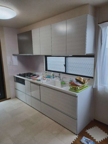 | お客様のご要望 | 木目の濃い色のキッチンなので部屋が暗く見えてしまい棚が開き扉なので収納も狭く、スライド引き出しのタイプで色も明るくしたい。子供もいるので食洗機をつけたい。 |